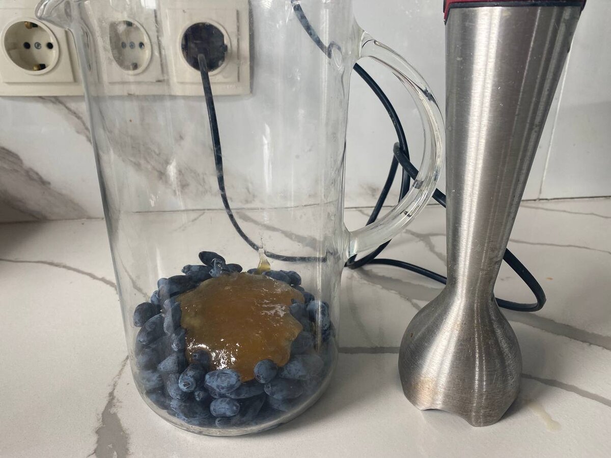 Взбиваем жимолость и мед, добавляем охлажденную минеральную воду