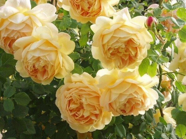 Восхитительные золотистые цветки английских роз "Голден Селебрейшн" (Golden Celebration) селекции Дэвида Остина обладают чайным аромат со слабыми оттенками вина Сотерн и клубники.