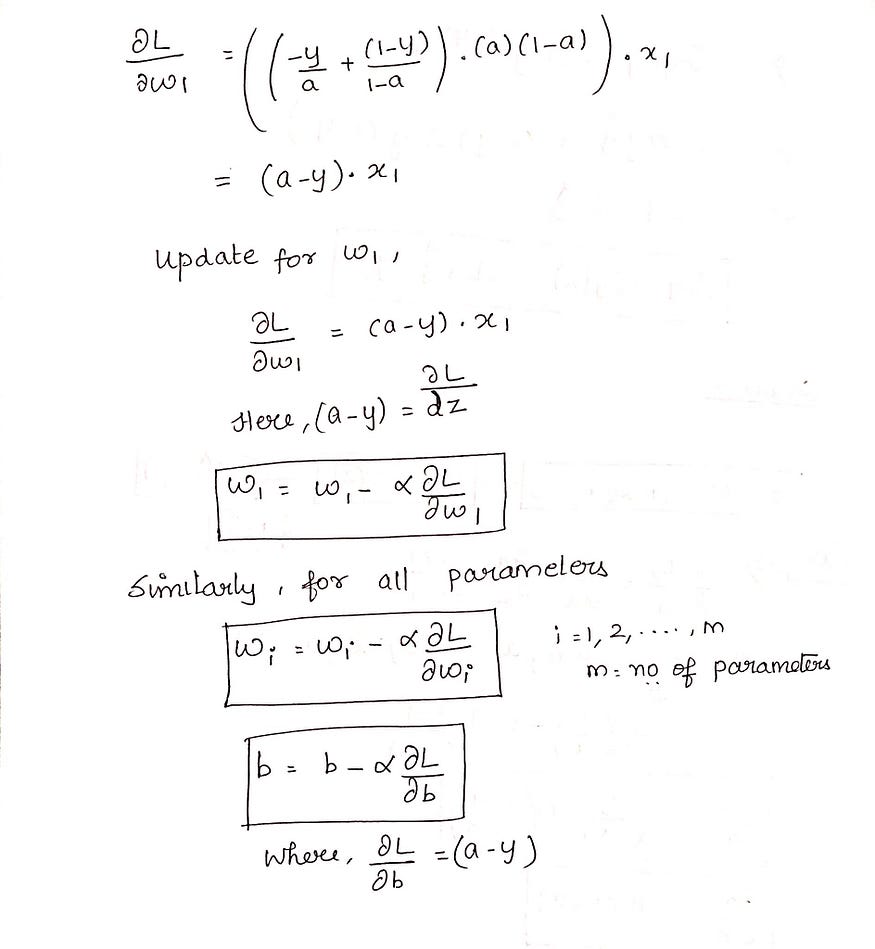 def weightInitialization(n_features): w = np.zeros((1,n_features)) b = 0 return w,b def sigmoid_activation(result): final_result = 1/(1+np.exp(-result)) return final_result def model_optimize(w, b, X, Y): m = X.shape[0] #Prediction final_result = sigmoid_activation(np.dot(w,X.T)+b) Y_T = Y.T cost = (-1/m)*(np.sum((Y_T*np.log(final_result)) + ((1-Y_T)*(np.log(1-final_result))))) #Gradient calculation dw = (1/m)*(np.dot(X.T, (final_result-Y.T).T)) db = (1/m)*(np.sum(final_result-Y.T)) grads = {"dw": dw, "db": db} return grads, cost def model_predict(w, b, X, Y, learning_rate, no_iterations): costs = [] for i in range(no_iterations): grads, cost = model_optimize(w,b,X,Y) dw = grads["dw"] db = grads["db"] #weight update w = w - (learning_rate * (dw.T)) b = b - (learning_rate * db) if (i % 100 == 0): costs.append(cost) #print("Cost after %i iteration is %f" %(i, cost)) #final parameters coeff = {"w": w, "b": b} gradient = {"dw": dw, "db": db} return coeff, gradient, costs def predict(final_pred, m): y_pred = np.zeros((1,m)) for i in range(final_pred.shape[1]): if final_pred[0][i] > 0.5: y_pred[0][i] = 1 return y_pred