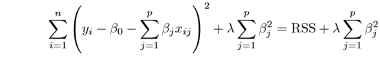 Above image shows ridge regression, where the RSS is modified by adding the shrinkage quantity. Now, the coefficients are estimated by minimizing this function. Here, λ is the tuning parameter that decides how much we want to penalize the flexibility of our model. The increase in flexibility of a model is represented by increase in its coefficients, and if we want to minimize the above function, then these coefficients need to be small. This is how the Ridge regression technique prevents coefficients from rising too high. Also, notice that we shrink the estimated association of each variable with the response, except the intercept β0, This intercept is a measure of the mean value of the response when xi1 = xi2 = …= xip = 0.
