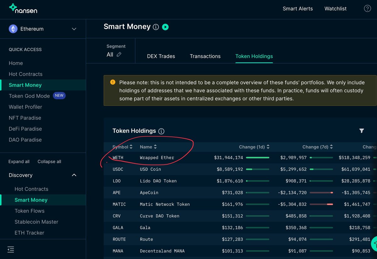 Давайте начнем с анализа WETH на Nansen - это бесспорно любимый токен "smart money". На сегодняшний день WETH составляет 60% портфелей с явным накоплением и восходящим трендом с середины апреля:
