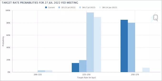 Вероятность того, что ФРС повысит ставки на 100 базисных пунктов в июле, составляет 85% (скромно, учитывая изменение Индекса потребительских цен на 9,1% - самое высокое за последние 40 лет). Буллард сам сказал, что целевые ставки к концу года составляют 3,75%-4%.