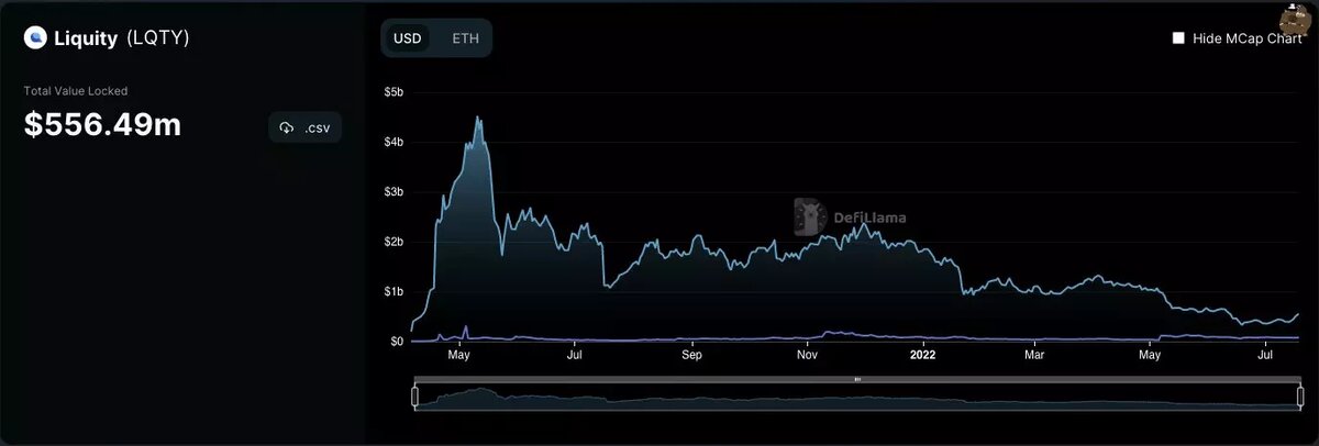 Ознакомьтесь с TVL от Liquity (децентрализованное приложение для однорангового кредитования). От почти $5 млрд долларов скатились до скудных $556 млн (минимум за все время). Кредиты и кредитное плечо чрезвычайно важны (при правильном использовании), поскольку они необходимы для поддержки активности в сети и стимулирования покупок.