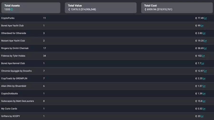 ...не говоря уже об их NFT. Только в кошельке Starry Night их общая стоимость около 12 500 ETH, и все они могут быть слиты со скидкой. Так же у них есть обезьяны, панки и т.д: