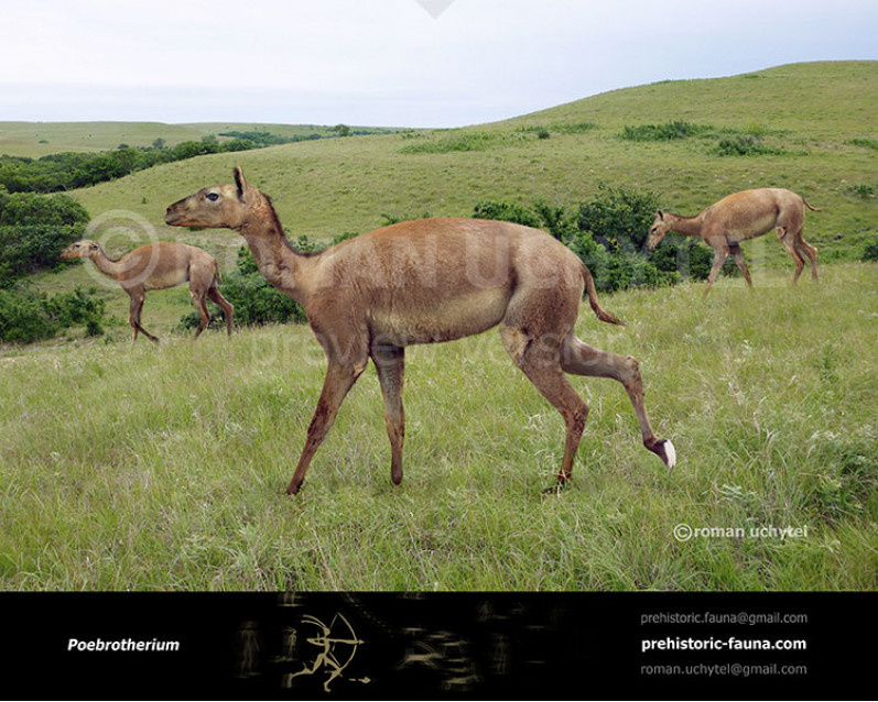 Poebrotherium — вымерший род верблюдовых, эндемичный для Северной Америки. Они жили с эоцена по миоцен около 32 миллионов лет. Poebrotherium был назван ученым Джозефом Лейди в 1848 году и его связь с ископаемыми из Уайт-Ривер была расширена в 1853 году. Он был связан с современными ламами, хотя с 1848 по 1853 год было мало нового материала. Было найдено всего три образца зубов Poebrotherium. Его череп напоминал череп ламы, конечности были приспособлены для скорости, но он не был привязан к конкретной среде. Зубы были более общими, чем у современных верблюдовых, возможно, он был травоядным или смешанным животным. Poebrotherium занимал место газели или оленя в экосистеме. Ископаемые останки показали, что он был добычей для энтелодонта Archaeotherium.