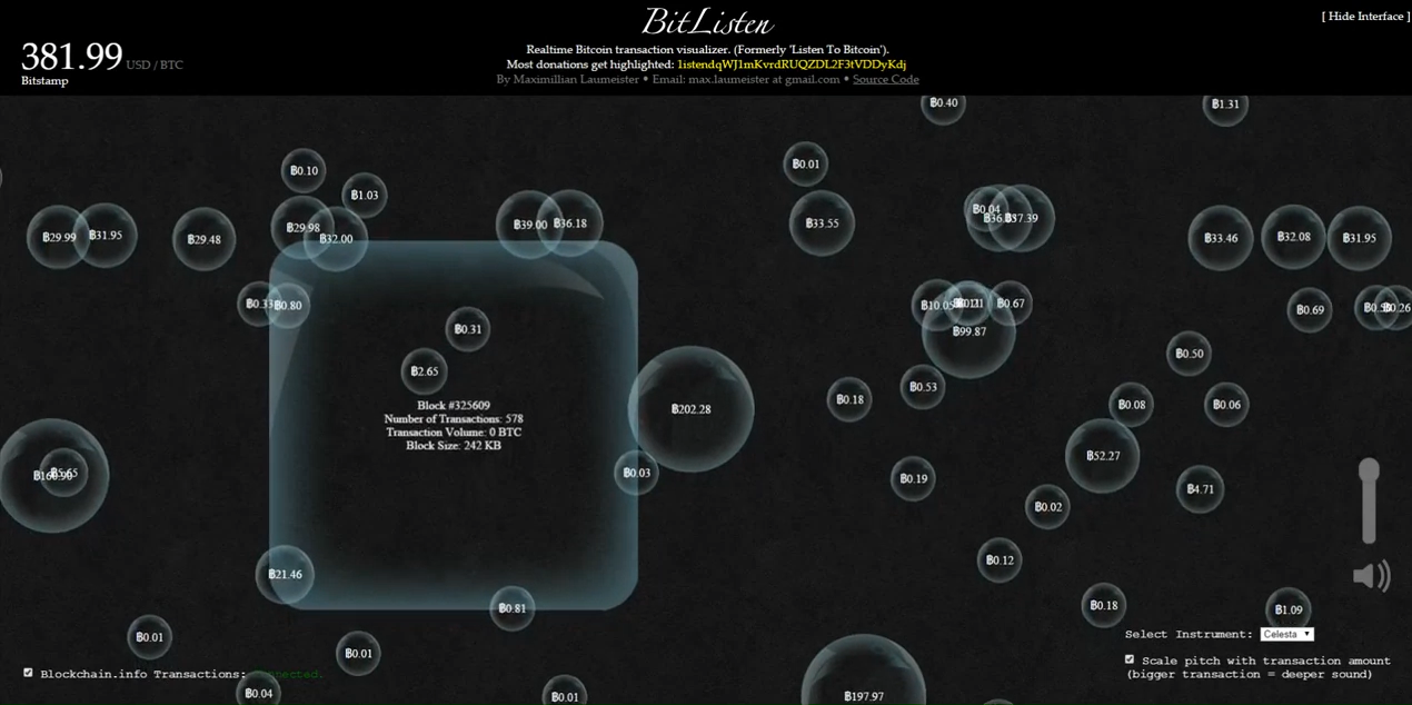 Это интересная, необычная и полезная инновация. Если Вы ранее когда-либо хотели узнать, что такое звук транзакций Биткойна, то используйте такую возможность с Bitlisten. Доступны визуализация транзакций Биткойна и прослушивание мелодии блокчейна!