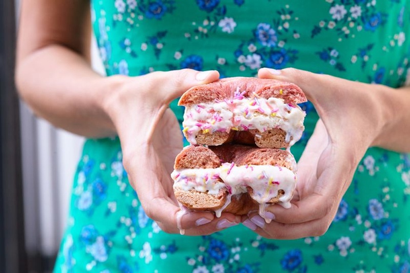 На кондитерском рынке появился очередной гибрид - пончики с мороженым внутри от Ben & Jerry. Это произведение кондитерского искусство можно назвать продолжением тренда на инстаграмную еду, о котором говорилось выше. Для начала кондитеры сделали два вида пончиков. Один напоминает небольшой тортик на день рождения. Этот пончик сделан из розового хлеба с мороженым со вкусом ванили и земляники. Второй - темный, сладко соленый пончик с эксклюзивным двойным карамельным брауни. Интересная идея не столько с позиции рецепта, а сколько с позиции возможной рекламы продукта. Ведь в разрезе пончики выглядят как бургеры, и подача такого продукта с названием вроде “айскрим-бургер”, вероятно, привлекла бы большее внимание.