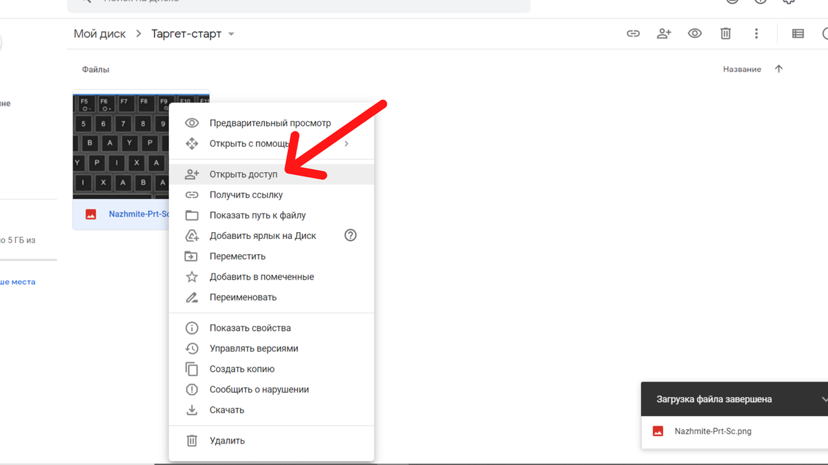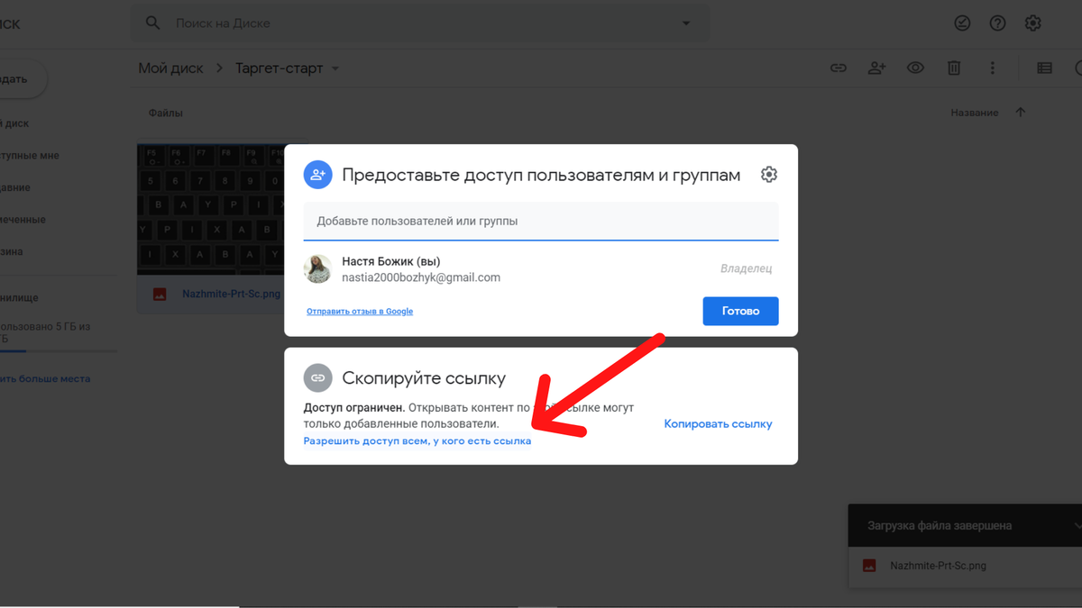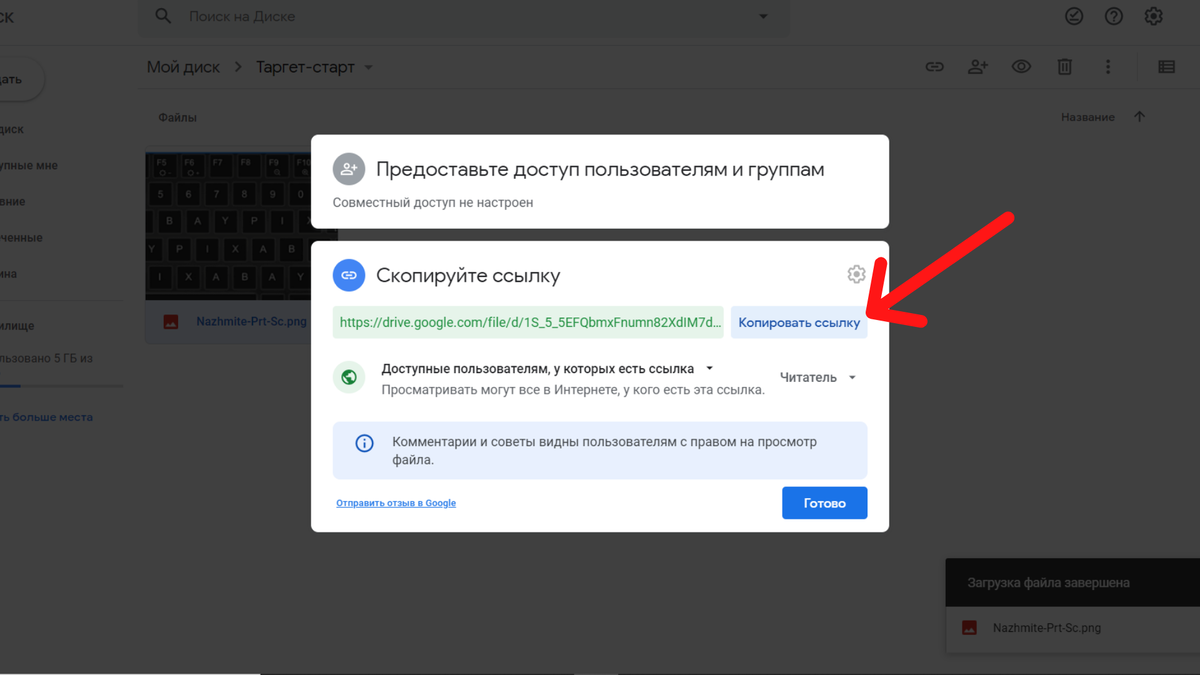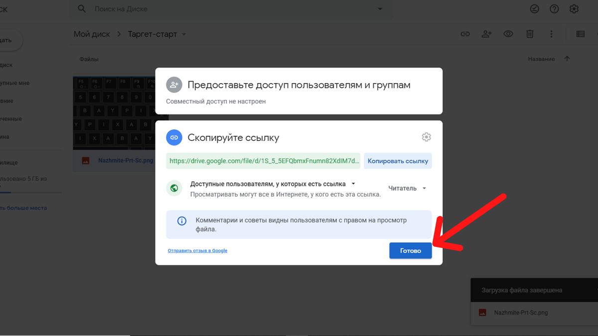 - После того, как сделали скриншот его нужно загрузить на гугл диск, предоставить доступ к скрину и скопировать ссылку на скрин.