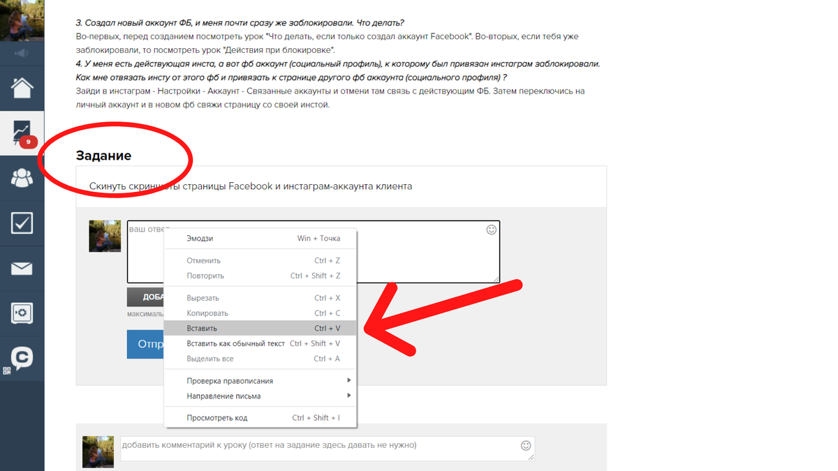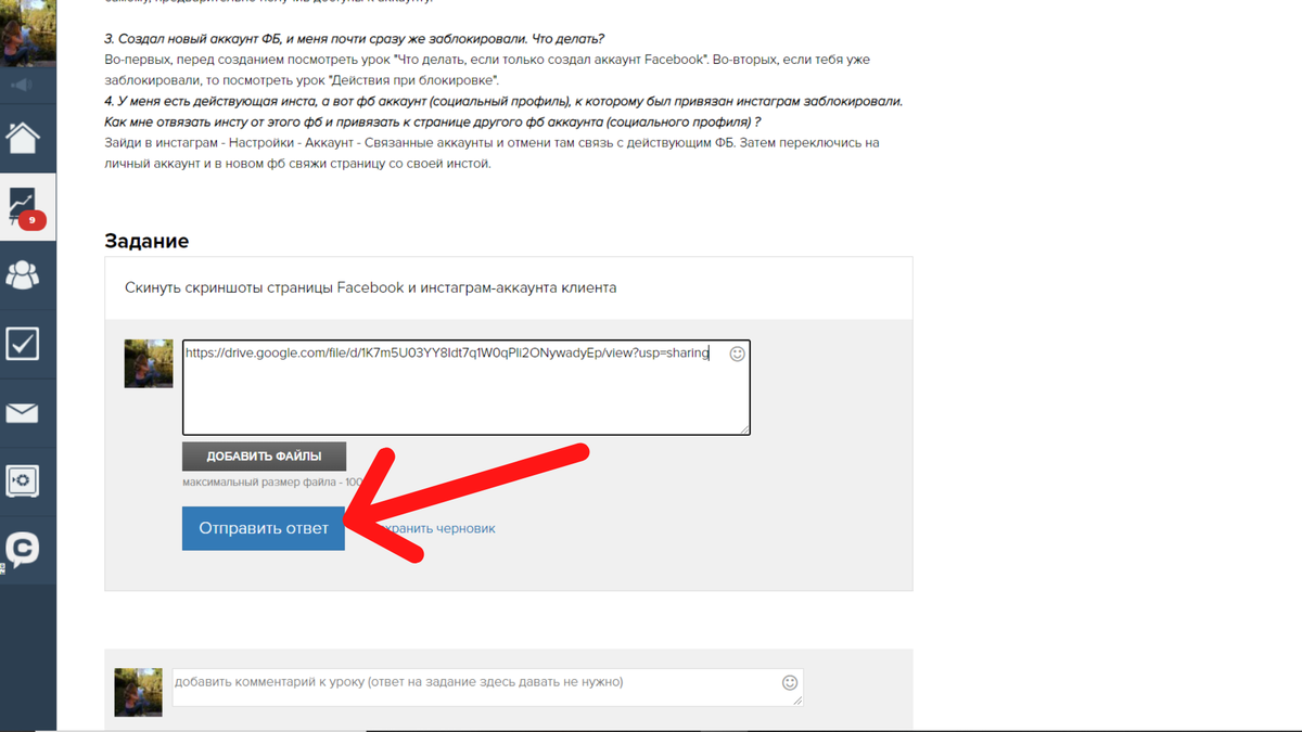 6. Вставить ссылку в поле "Задание" (это поле есть не у всех уроках, вставляем только там, где есть).