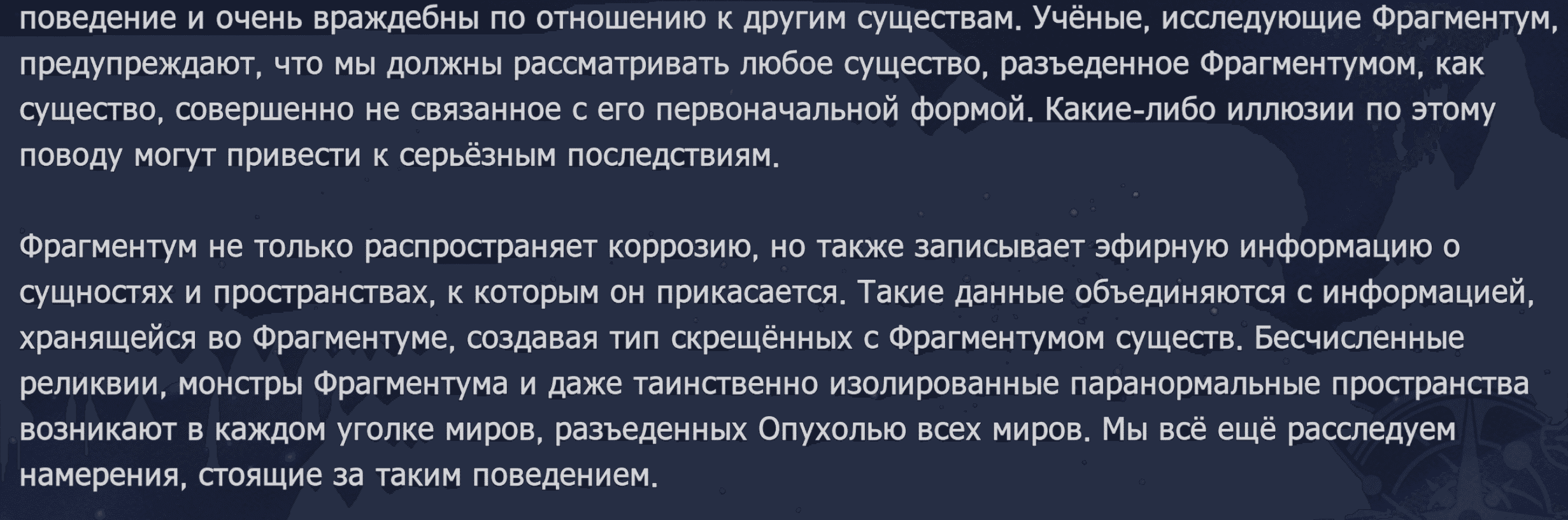 Говоря о дизайнах и описаниях материалов, мне бы хотелось обратить внимание ещё и на дизайны и описания монстров Фрагментума, с которых падают вышеупомянутые материалы, а также на места, которые являются результатом искажения пространства Фрагментумом.