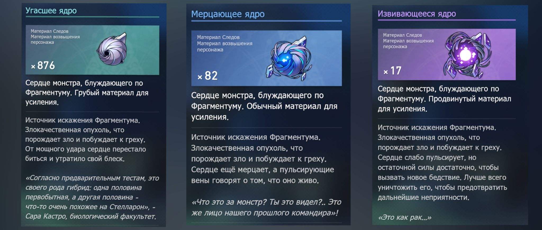 Что примечательно, оба материала — Мнимый лист и Квантовая рябь — падают с монстров и теней Фрагментума. Помимо этих материалов есть ещё один, который мы используем для возвышения некоторых персонажей — Угасающее, Мерцающее и Извивающееся ядра. Согласно описаниям материалов, это и есть источник искажения Фрагментума, а также сердце монстров Фрагментума. Сара Кастро описала ядро как «своего рода гибрид: одна половина первобытная, а другая половина — что-то очень похожее на Стелларон». Из описания других ядер мы можем сделать предположения о том, что вызванные Фрагментумом искажения в пространстве по принципу работы похожи на рак, то есть как раковые клетки постоянно делятся (непрерывно распространяются) и отказываются умирать. Например, Стелларон невозможно уничтожить, только запечатать, а в случае распространения Фрагментума на Ярило удалось только остановить распространение, однако последствия искажения никуда не исчезли. Фрагментум как явление использует информацию из окружающего пространства и перерабатывает её, из чего и появляются монстры Фрагментума, которые когда-то были живыми существами, а некоторые — даже людьми. Это влияние Фрагментума мы уже наблюдали во время сражений с Тенями Хранительниц Сирил и Коколии.