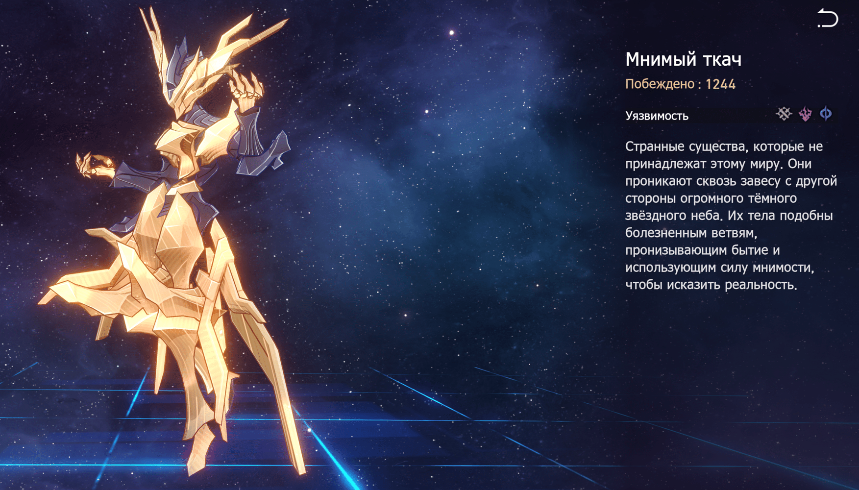 Второй противник — тот самый Мнимый Ткач; так же как и Маска без Мыслей он имеет мнимый тип урона и одна из его уязвимостей квантовая. По описанию и дизайну становится понятно, что это существо имеет много общего если не с Мнимыми Конструкциями, то как минимум с самим Древом Мнимости: эти сущности пришли в чужой Мир сквозь завесу с другой стороны огромного тёмного звёздного неба [вероятно, это либо описание самого Моря Квантов, либо описание того, что находится по ту сторону пространственного разрыва, что также может быть Морем Квантов или Мнимым Пространством], а их тела подобны болезненным ветвям, пронзающим бытие и использующим силу мнимости, чтобы исказить реальность. Вероятно, Мнимые Ткачи имеют куда больше силы и влияния на реальность, чем пока что показано в игровой механике; либо это всего лишь слабые мнимые сущности, и существует что-то, что дало начало распрострастранению Стелларонов и Фрагментума.
