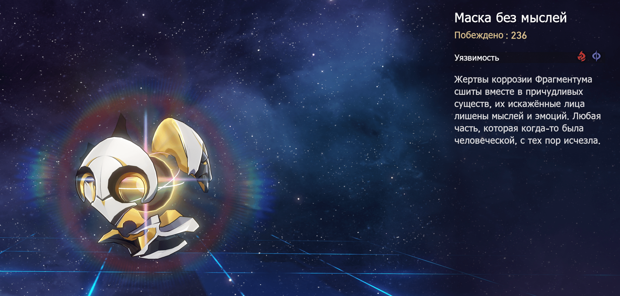 Первый противник — Маска без Мыслей, имеет мнимый тип урона и одна из её уязвимостей квантовая. По описанию и по дизайну напоминает группу врагов Мнимого типа в HI3 — Imaginary Constructs [Мнимые Конструкции]. Мнимые Конструкции — это тип врагов, происходящих из Мнимого Пространства. По телу они могут напоминать Меха, Квантовых Теней и даже Зверей Хонкая, хотя их силы отличаются. Их основные цвета — чёрный и золотой.