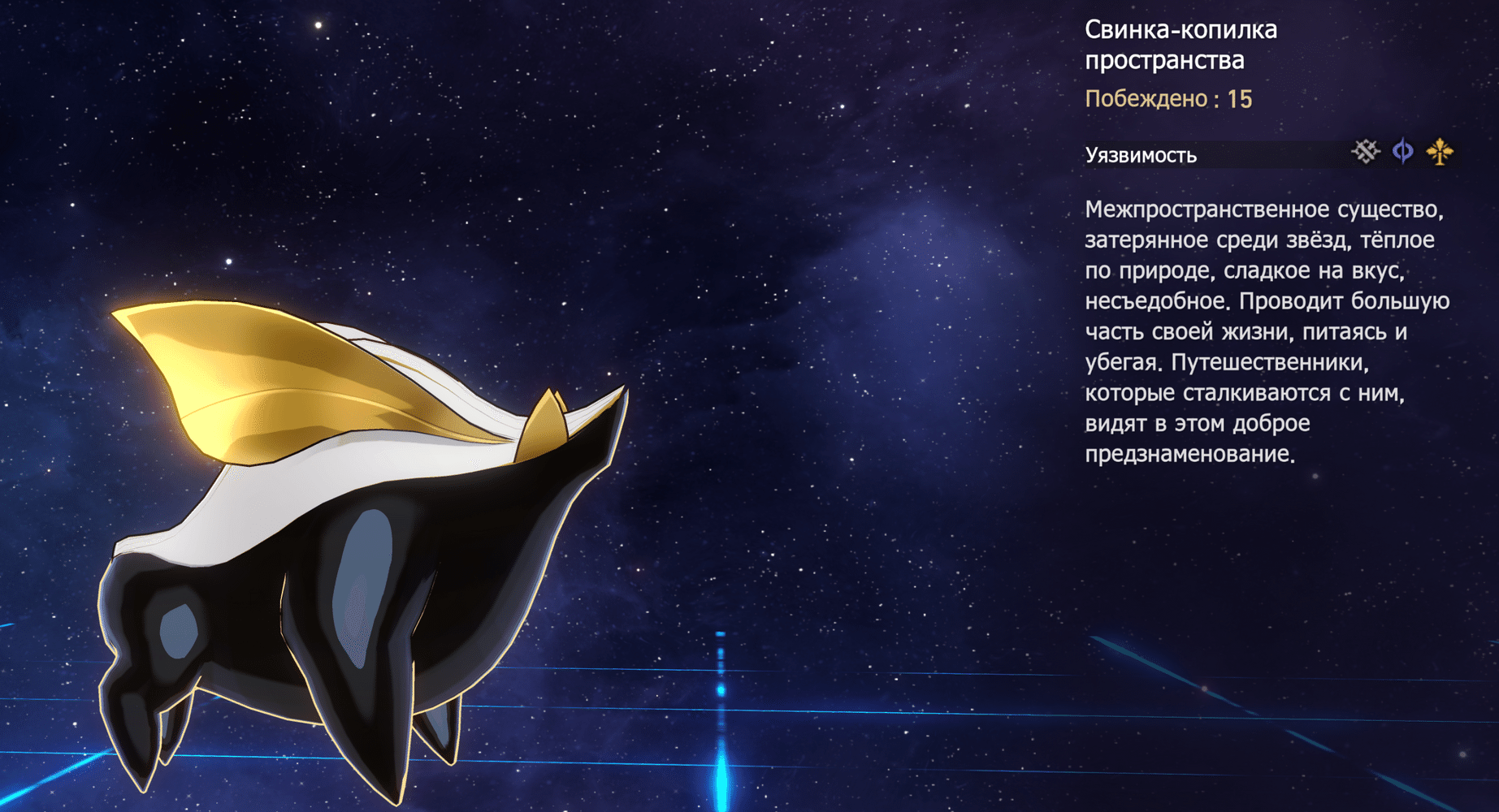 Говоря о чёрных дырах, стоит упомянуть ту самую свинку-копилку пространства, которая может спокойно прыгать в кротовые норы, как ни в чём не бывало перемещаясь по мирам. Самой интересной частью у этого безобидного противника является расцветка из белого, чёрного и золотистого (в случае более редкого экземпляра у свинки последовательности окраска серебряная). Самой интересной, на мой взгляд, деталью является её уязвимость к квантовому, мнимому и физическому типу урона — словно намекая, что Мнимое Древо и Квантовое Море обладают сильным воздействием на эту свинку.