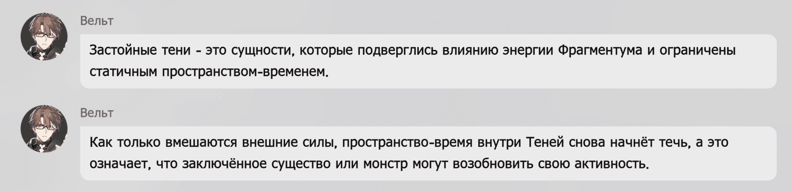 Как вы уже заметили, боссы в H:SR называются Застойными Тенями. Почему такое название у боссов в игре, не объясняется. Вельт рассказывает нам о том, что это сущности, которые подверглись влиянию Фрагментума. Сущностями, которыми они были прежде, они уже не являются.