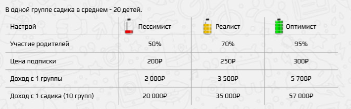 В среднем с одного детского сада, который посещает 200-300 детей, выручка составляет 30 000 – 45 000 рублей. С каждым последующим подключённым садиком или школой, прибыль увеличивается.