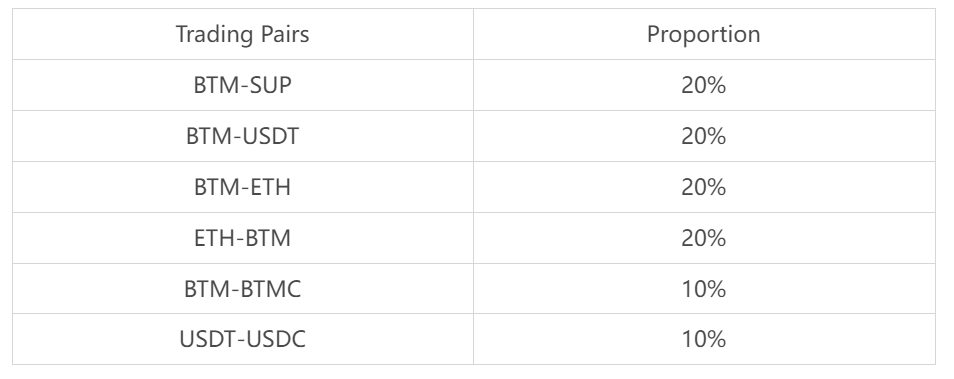 BMC SuperTx Liquidity Mining добавляет новое вознаграждение за ликвидность торговых пар BTC-ETH,ETH-BTM и USDT-USDC, а коэффициент корректировки следующий: