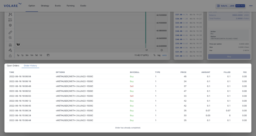Панель [Order History] показывает подробный список исторических данных.
