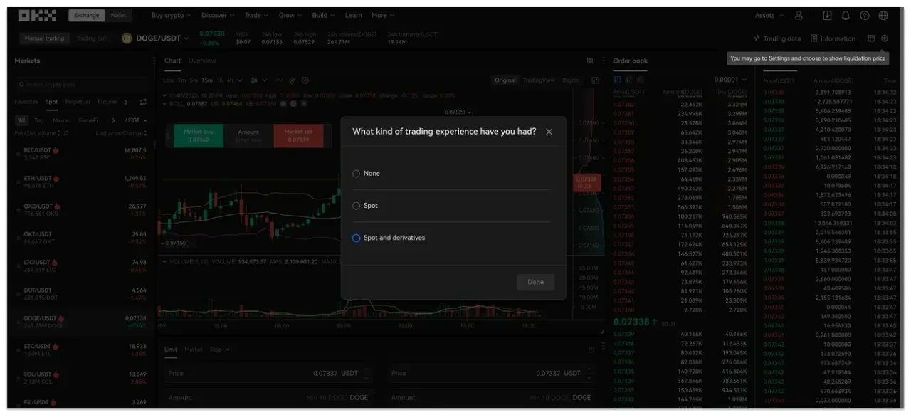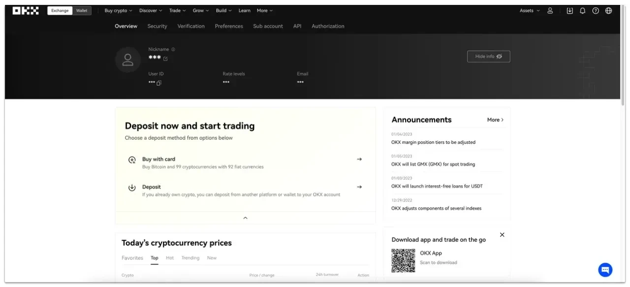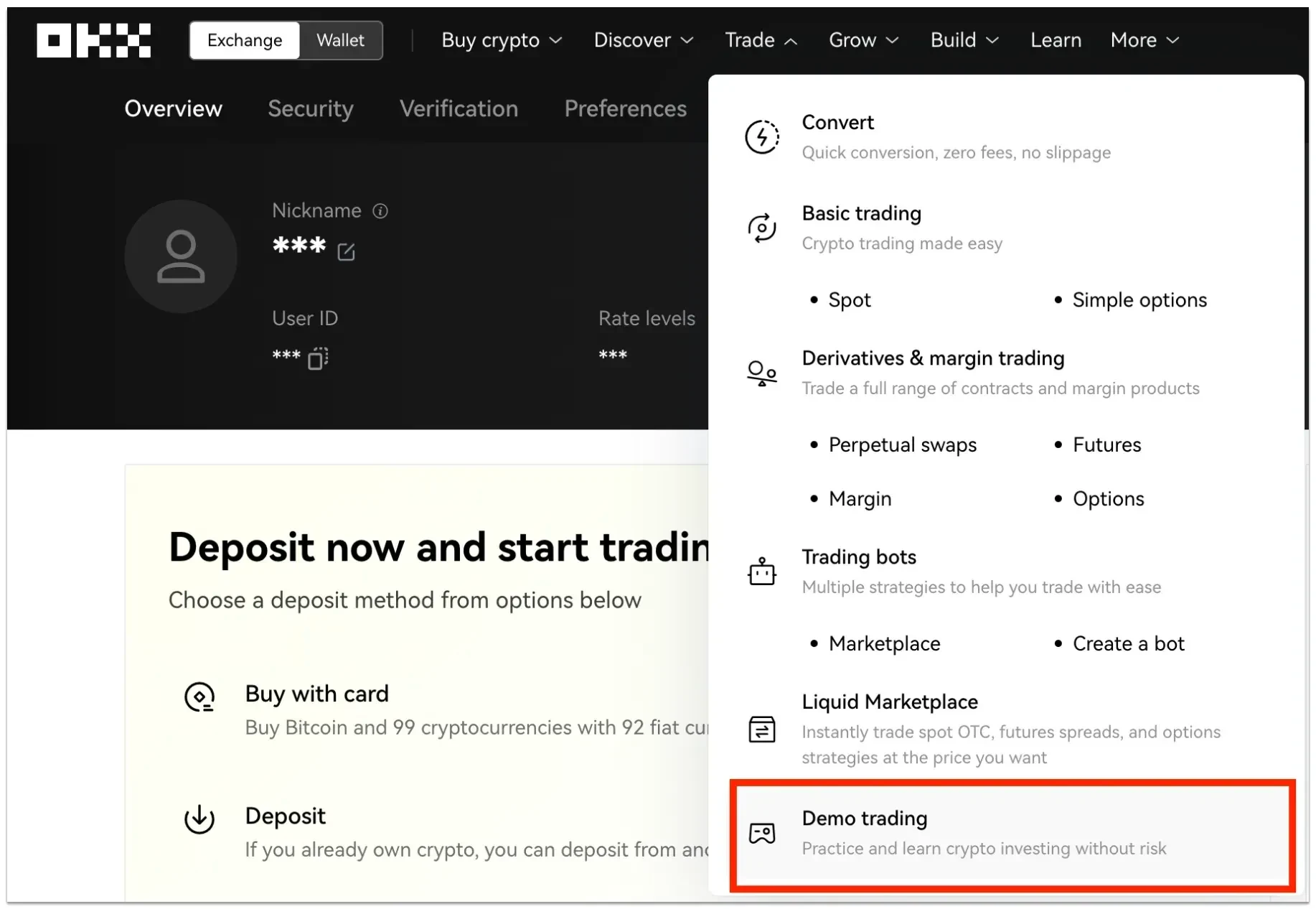 Теперь у вас есть доступ к главной странице вашего аккаунта OKX. Чтобы начать торговать, у вас есть две опции: