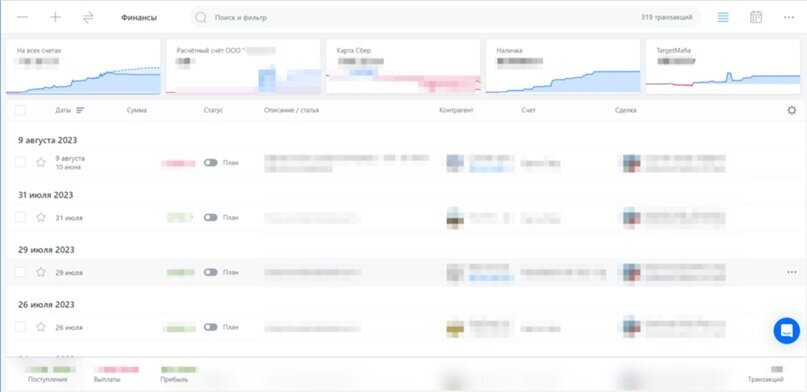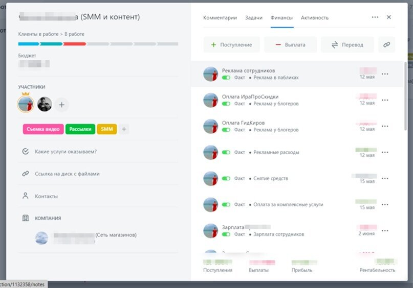 Внутри карточки-сделки вся информация: комментарии, переписка с сотрудниками, метки, нужные ссылки и контакты, а так же главное - детализация всех расходов и доходов по конкретной сделке, чтобы контролировать плановую и фактическую рентабельность по каждому клиенту и фиксировать дебиторку.