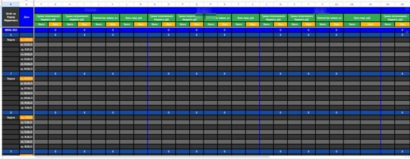 Далее мы собрали на базе Google Sheets реестры сбора данных по маркетингу компании, для того чтобы отслеживать данных в цифрах (сколько бюджетов тратим, сколько заявок получаем, какие цены лидов).