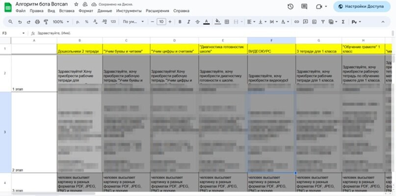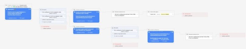 Общая структура бота выглядит примерно так. Всего триггерных фраз получилось 35 и 35 разных сценариев срабатывания бота. На скрин влезли не все связки :)