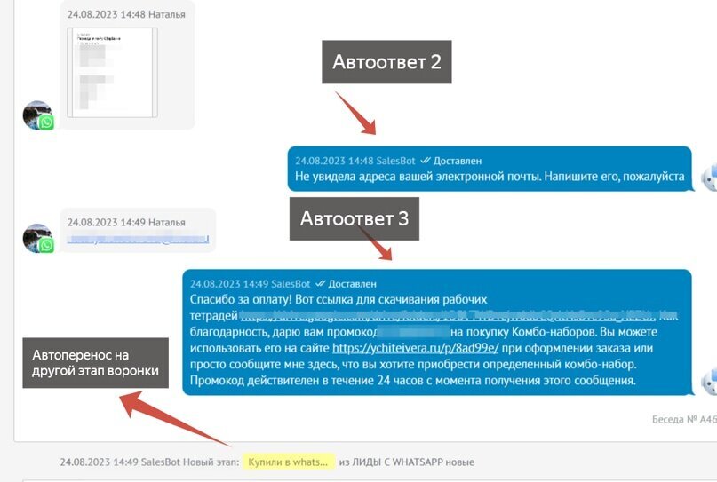После оплаты бот автоматически запрашивает почту и отправляет ссылки на материалы, а так же индивидуальный промокод. Так же он записывает почту в поле контакта и переносит сделку на следующий этап.