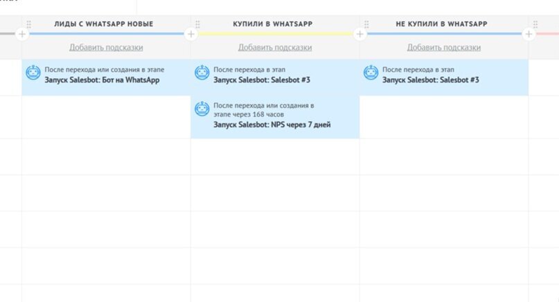 На всех этапах воронки настроены автоматические действия через Salesbot. Ключевое действие находится на этапе «Лиды в WhatsApp Новые», далее после покупки лид автоматически переносится на этап «Купили в WhatsApp», и через 7 дней бот запрашивает обратную связь для замера NPS.