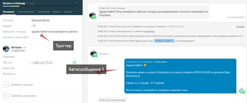 Так это выглядит из окна сделки в AMO CRM. Триггерное сообщение так же записывается в поле сделки АMO CRM, для дальнейшего использования.