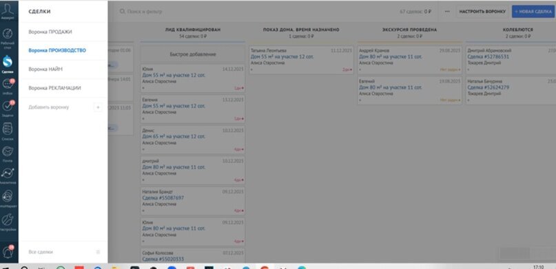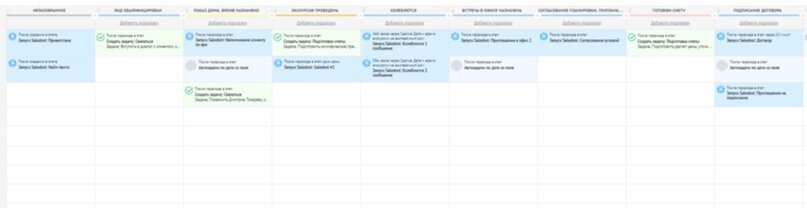 Сделали 4 основные воронки для удобства работы, львиная доля ведётся в Продажах. В воронку добавили автоматические сообщения через SalesBot, автозадачи по дате. Ключевая цель, которую ставили перед собой - снять рутинные действия с менеджера, чтобы бот делал максимум из того что возможно снять с человека. А так же цель №2 - чтобы клиент был постоянно на связи с нами, видел и ощущал что про него не забыли.