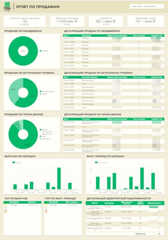 Все показатели по продажам мы можем наблюдать на странице «Продажи». В ней - все срезы по менеджерам, продуктам, источникам трафика, динамики по месяцам года, анализ дебиторской задолженности за объекты.