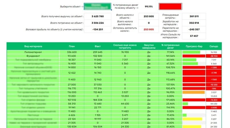 К нашему боту для клиента подвязали наглядный реестр учета Плана/Факта по каждому объекту в работе. Просто выбираешь нужный объект из списка, и видишь всю информацию по финансам внутри. Видно не вышел ли из плана. Если все необходимые материалы закупил - позиция станет зеленой, а если еще и потратили меньше, чем заложили в смете - то вообще красота, дополнительно заработали.