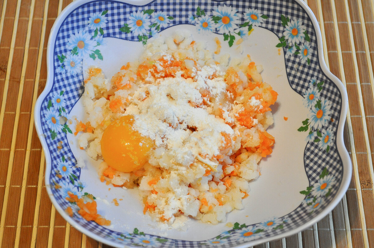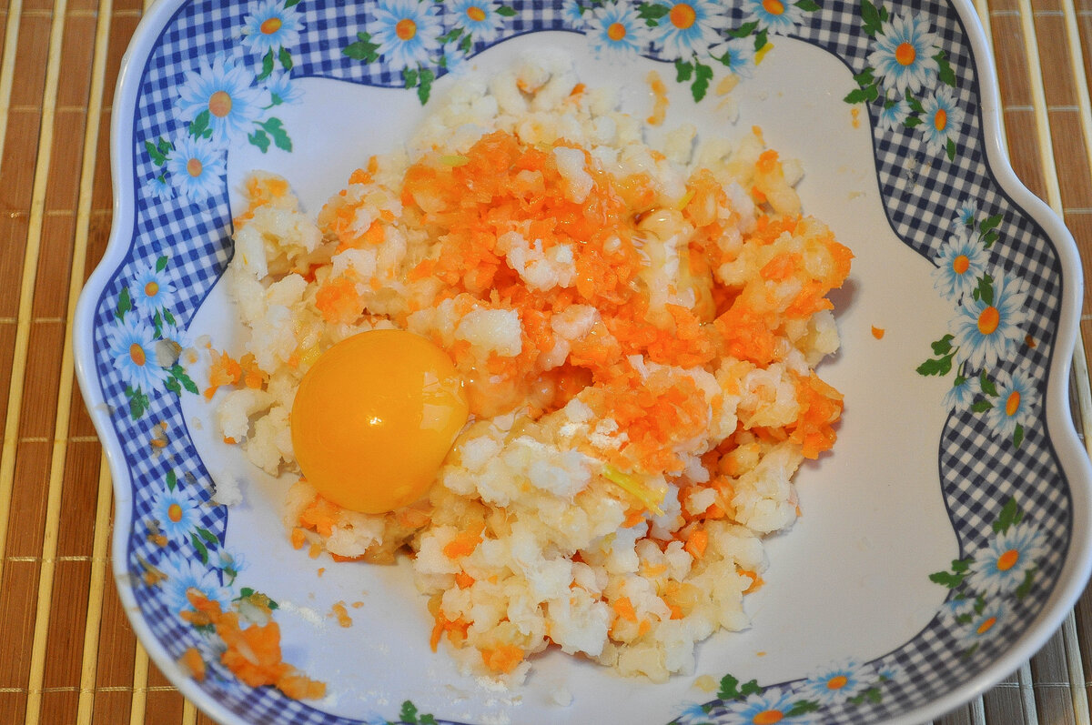 2. Морковь тщательно очистите от грязи и кожуры. Перекрутите овощ на мясорубке. Затем в туда же отправьте половинки лука и рыбу. В полученную смесь добавьте куриное яйцо.
