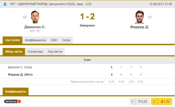 Феррер довольно легко выиграл Джонсона 6:1 и во втором сете он тоже шел явным фаворитом, тогда на джонсона давали плюс полтора за кф-т в районе двушки. В итоге Джонсон выиграл со счетом 7:5 вроде бы ничего удивительного, но факт.