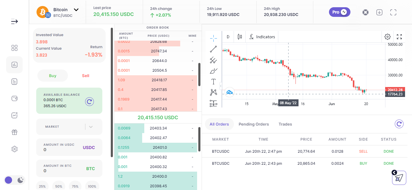 Доступны для торговли BTC, ETH, USDT и USDC. Выбираем для себя удобную пару и начинаем торговлю. Советую поторговать по всем парам которые есть.