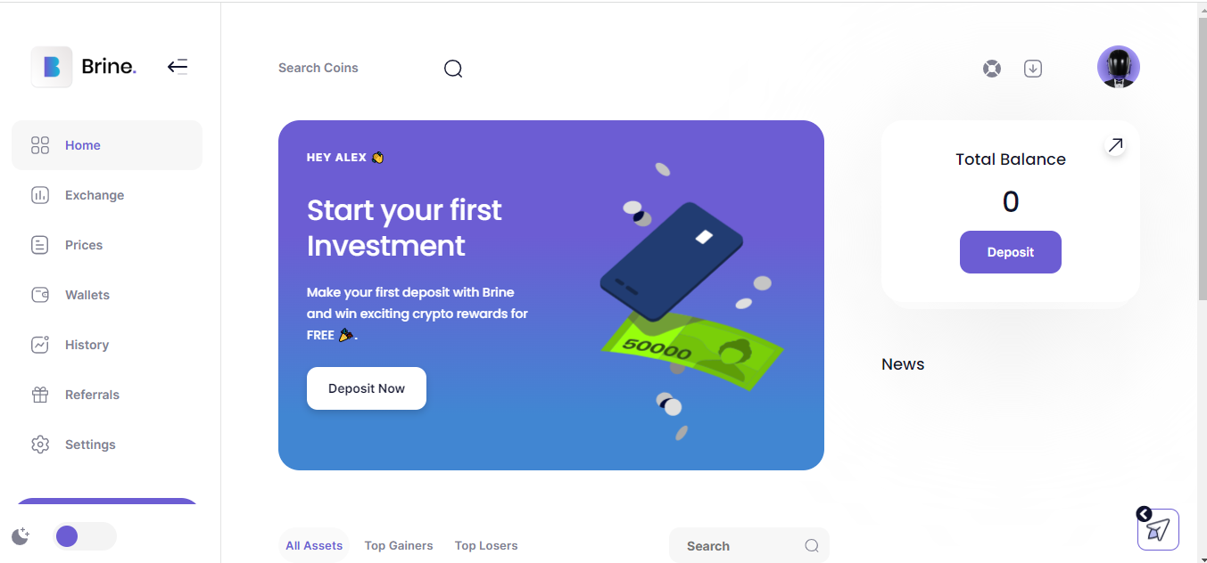 Далее нас перекидывает на саму торговую площадку Brine!