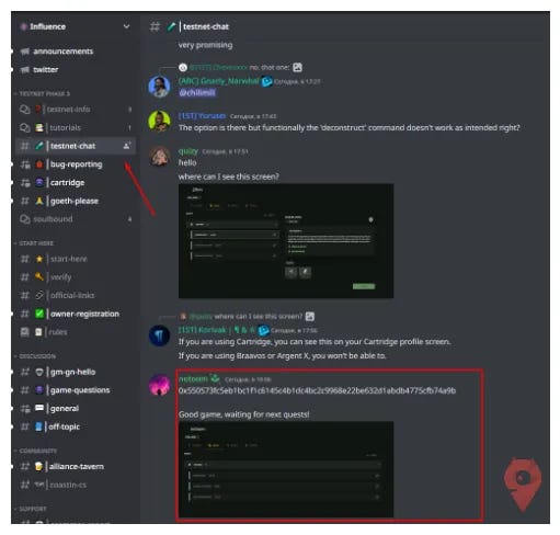 - Идем в Discord проекта в ветку testnet-chat присылаем скриншот, адрес, и пишем что-то хорошее