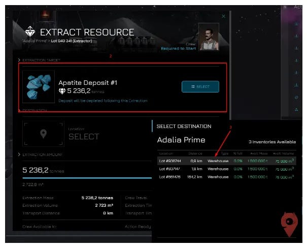 Чуть ниже нам необходимо выбрать Warehouse куда будут складироваться ресурсы. Нажимаем “Select” и выбираем любой из списка(3) Лучше выбирать ближайший!