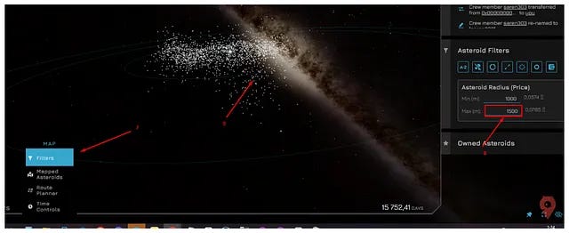 - Выставляем значение “1500” в графе MAX (8), это цена на астероид