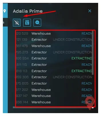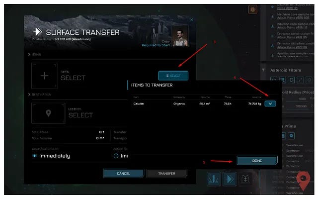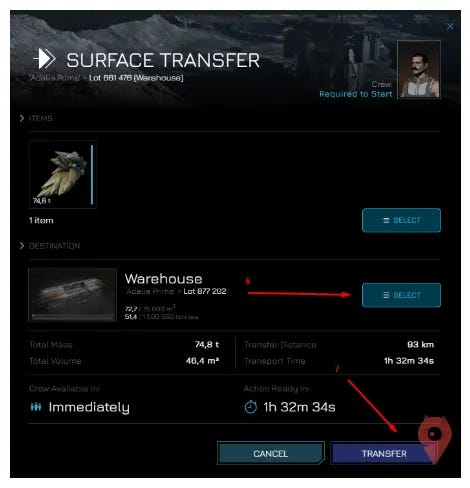 Запоминать в какой Warehouse был складирован ресурс необязательно, проще пробежаться по списку строений (1) и найти Warehouse c активной кнопкой “Surface transfer” (2), нажимаете ее.