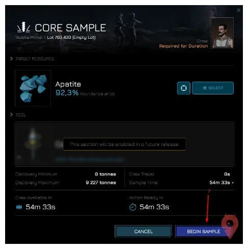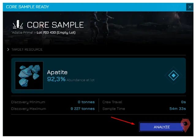 Core Sample у меня добыт 1, но можно добыть несколько и потом выбирать с каким будет работа нажимая на “Select” (2).