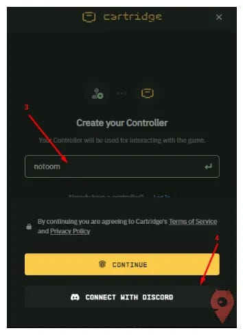 Переходим на сайт и нажимаем “Login with Cartrige”. Далее кликаем Create Controller и вписываем свой ник. Нажимаем “Connect to discord”.
