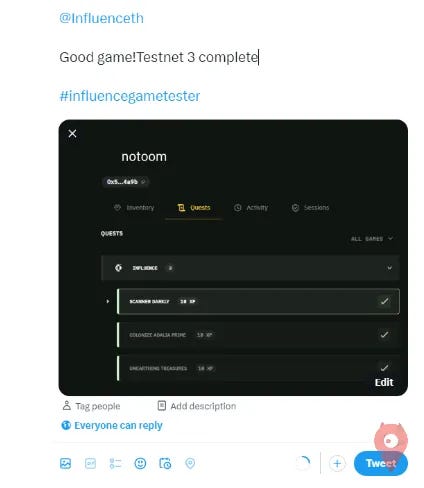 - Делаем твит, отметив @Influenceth и используя хэштег #influencegametester и адрес своего аккаунта.