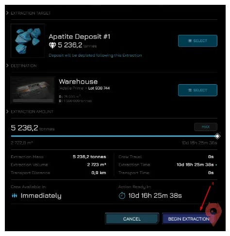 - Если ставили Extractor на месте где уже был добыт Core Sample переходите в меню “Extract Resource” (1).