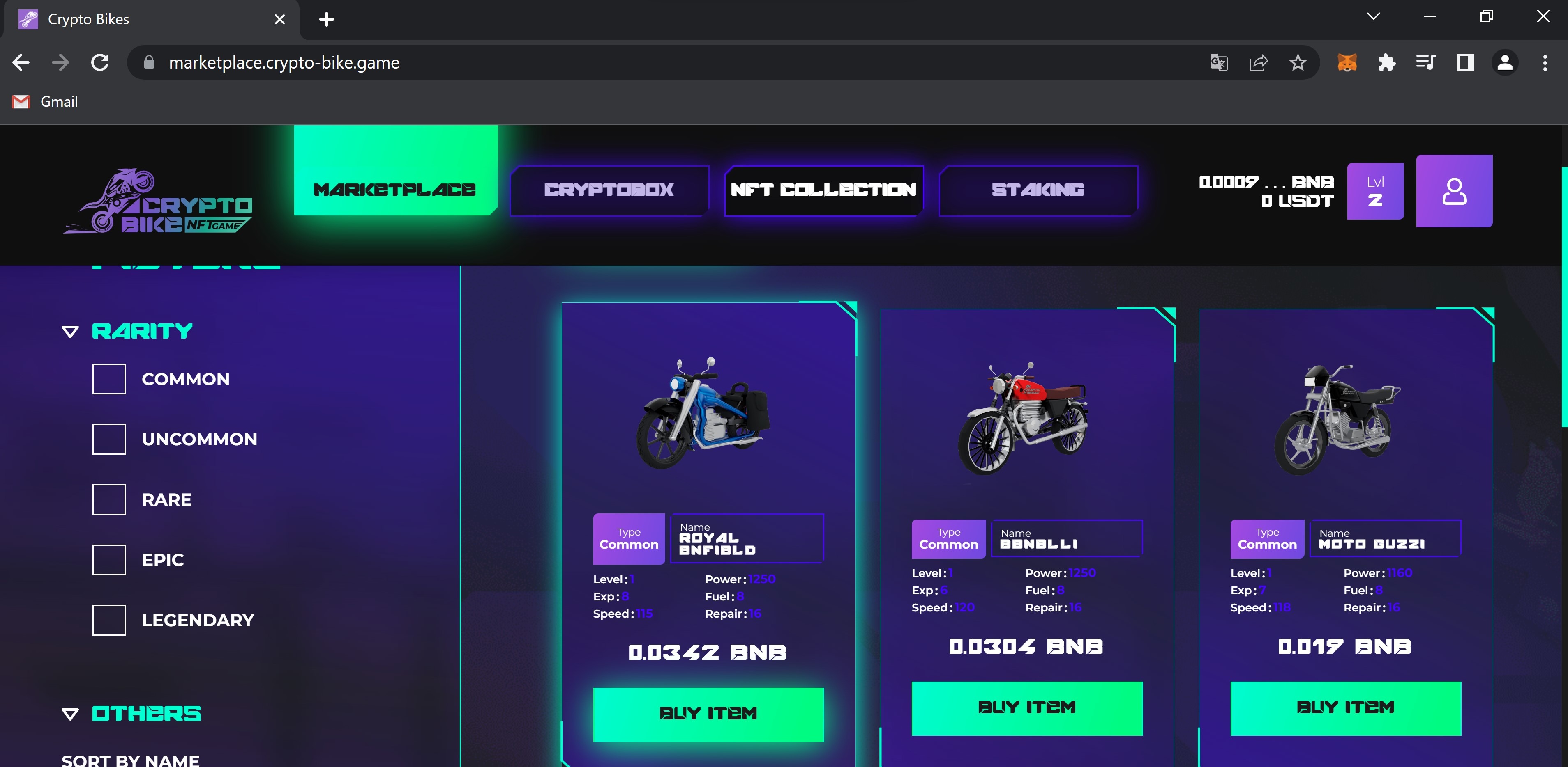 Пополни свой баланс, чтобы купить байк. Пока доступна функция покупки за BNB. Выбирай байк, который хочешь купить и переходи на MetaMask или любую другую биржу, откуда ты можешь пополнить свой личный счет. После пополнения твой баланс будет отображаться тут.