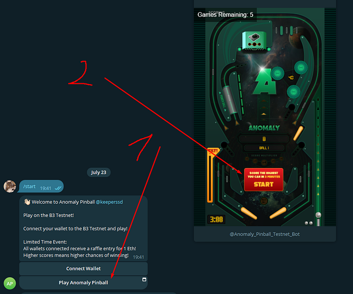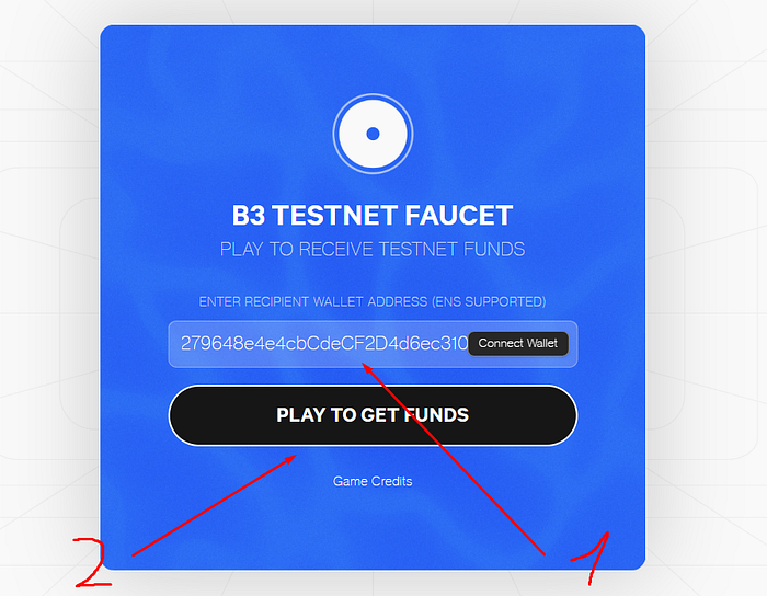 - Тыкаем на белый кружок и нам нужно будет сыграть в игру, чтобы получить тестовые $ETH в сети B3