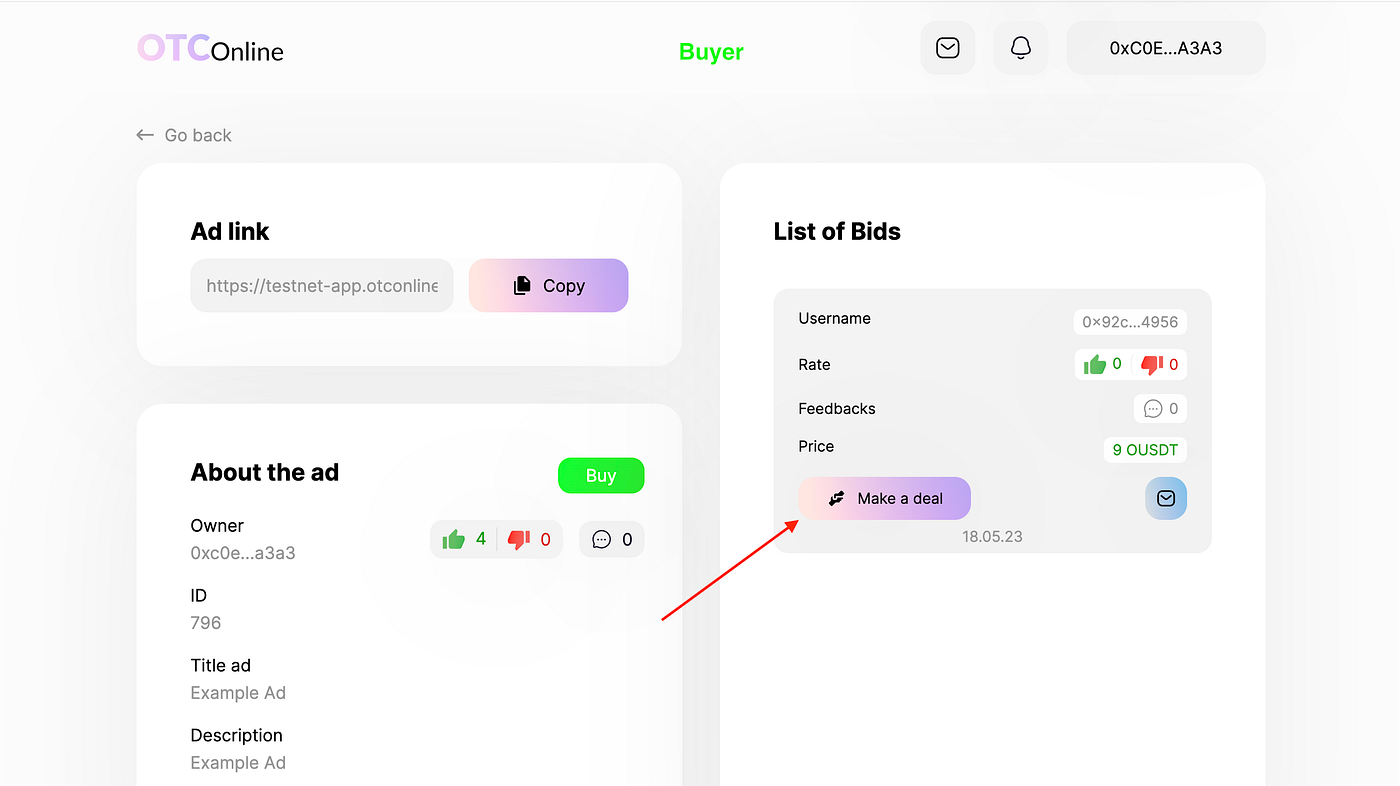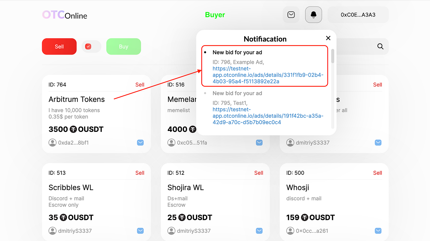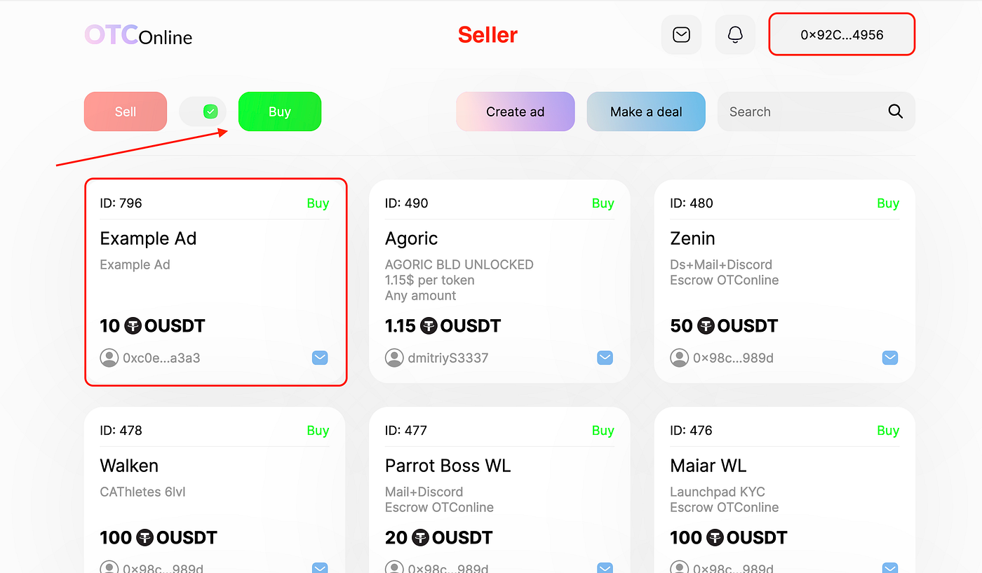 3.1. После подготовки кошелька переходим на OTCOnline, находим объявление, которое мы создали с другого кошелька и щелкаем по нему.