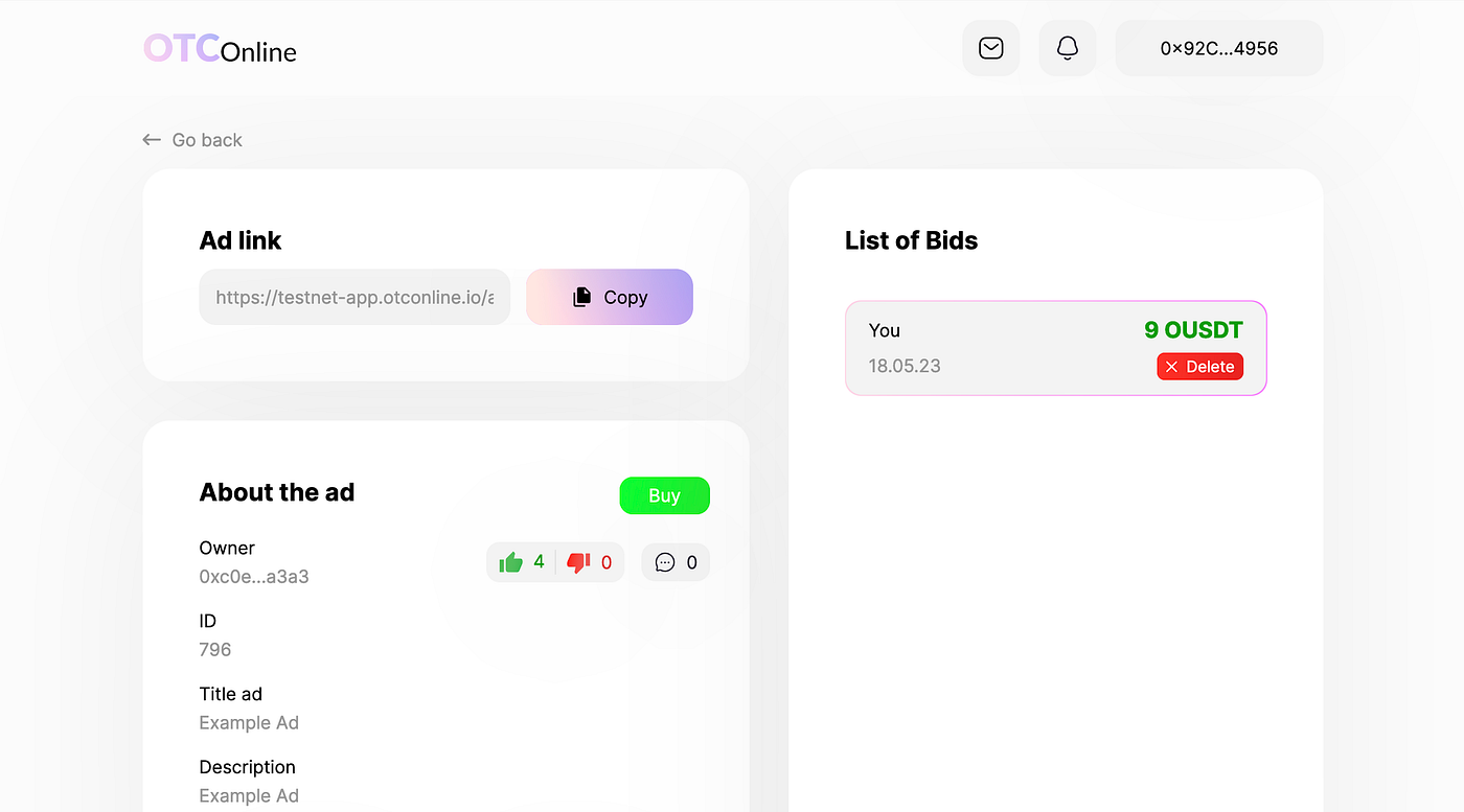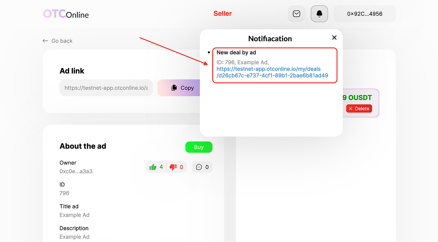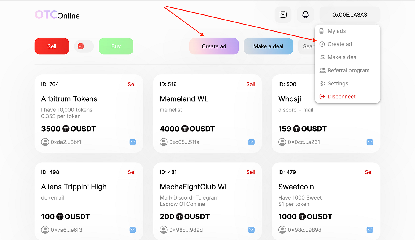 3.1. После подготовки кошелька переходим на OTCOnline, находим объявление, которое мы создали с другого кошелька и щелкаем по нему.