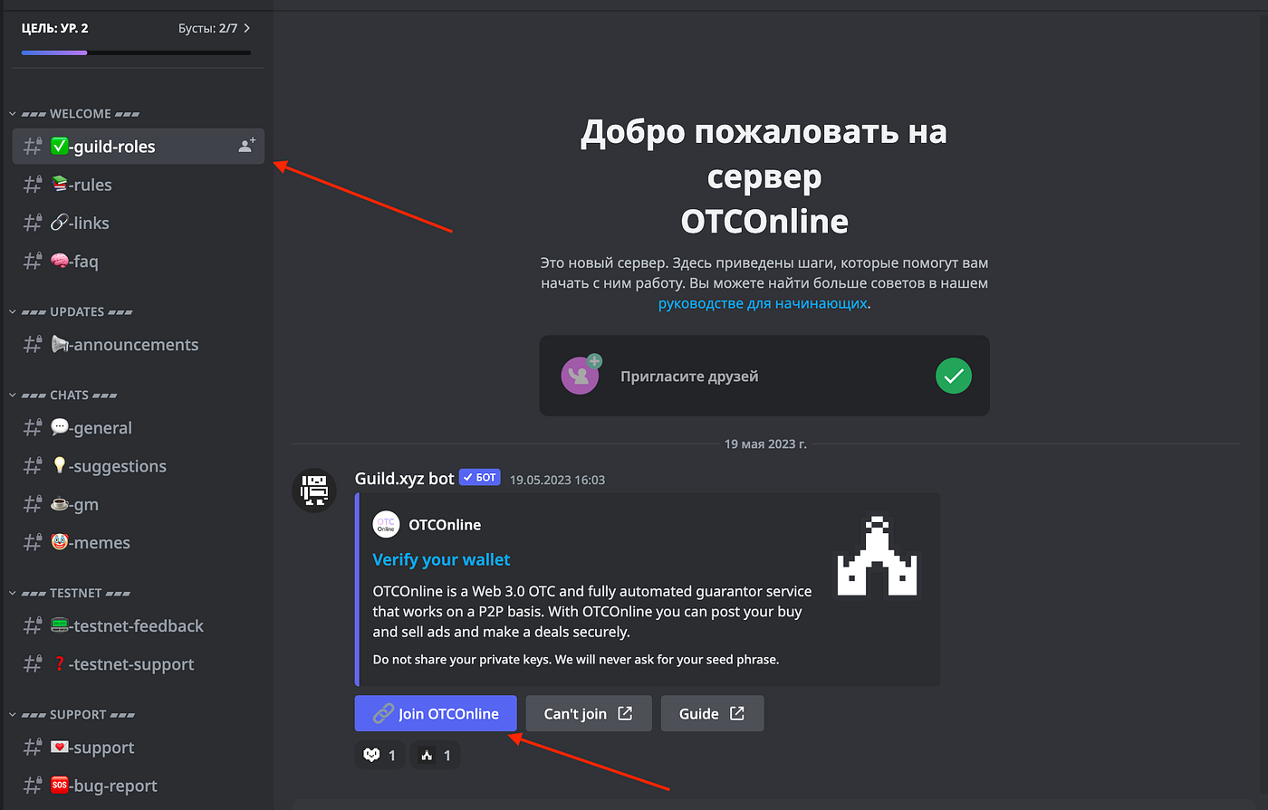 После завершения тестнета нужно оставить отзыв в дискорде за который дадут роль Early Adopters. Далее вступаем в гильдию, подключаем кошелек и получаем роль Testnet Participant. Чтобы проверить роль нажмите “Join OTCOnline” в дискорде в веткe ✅-guild-roles