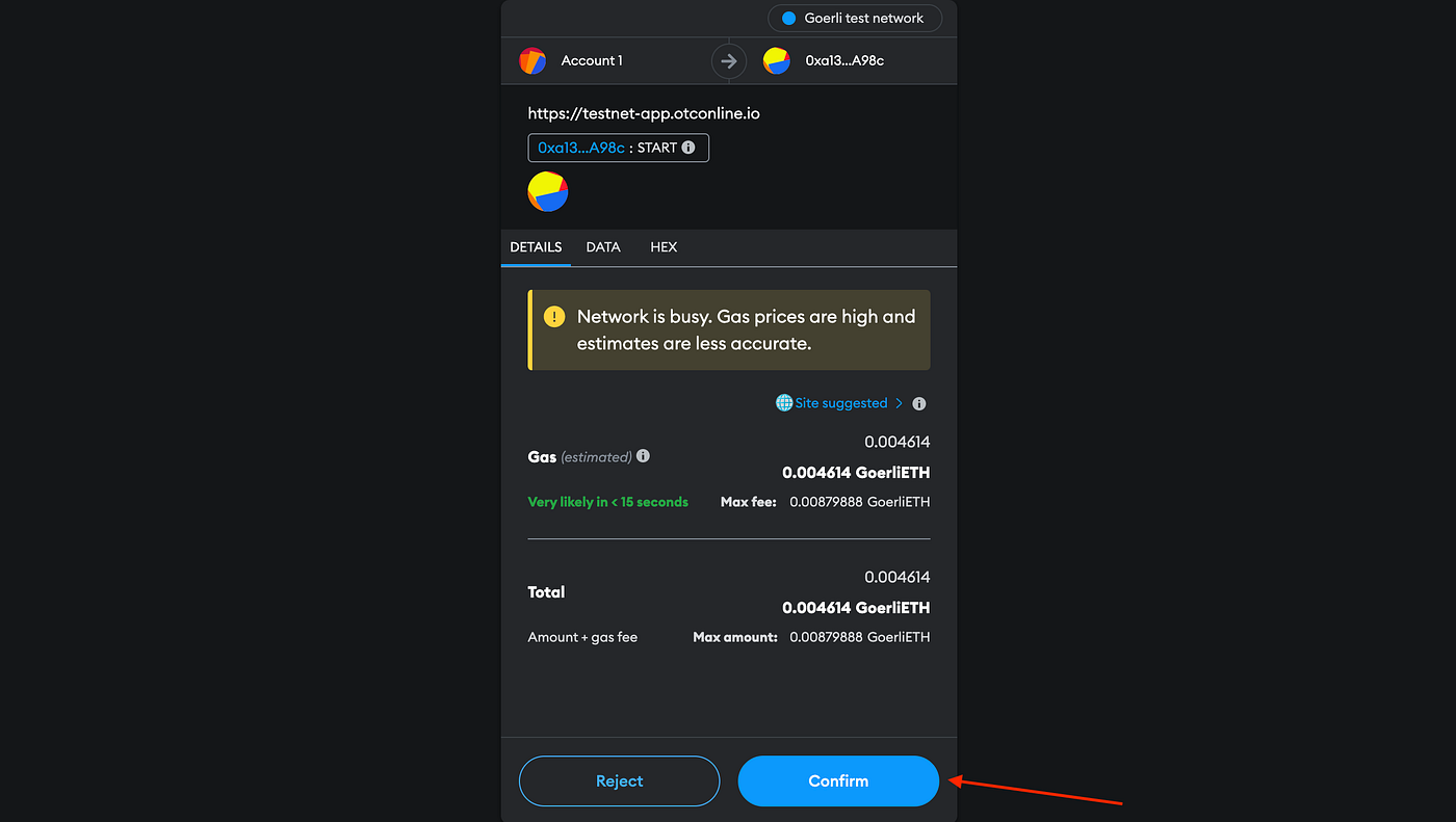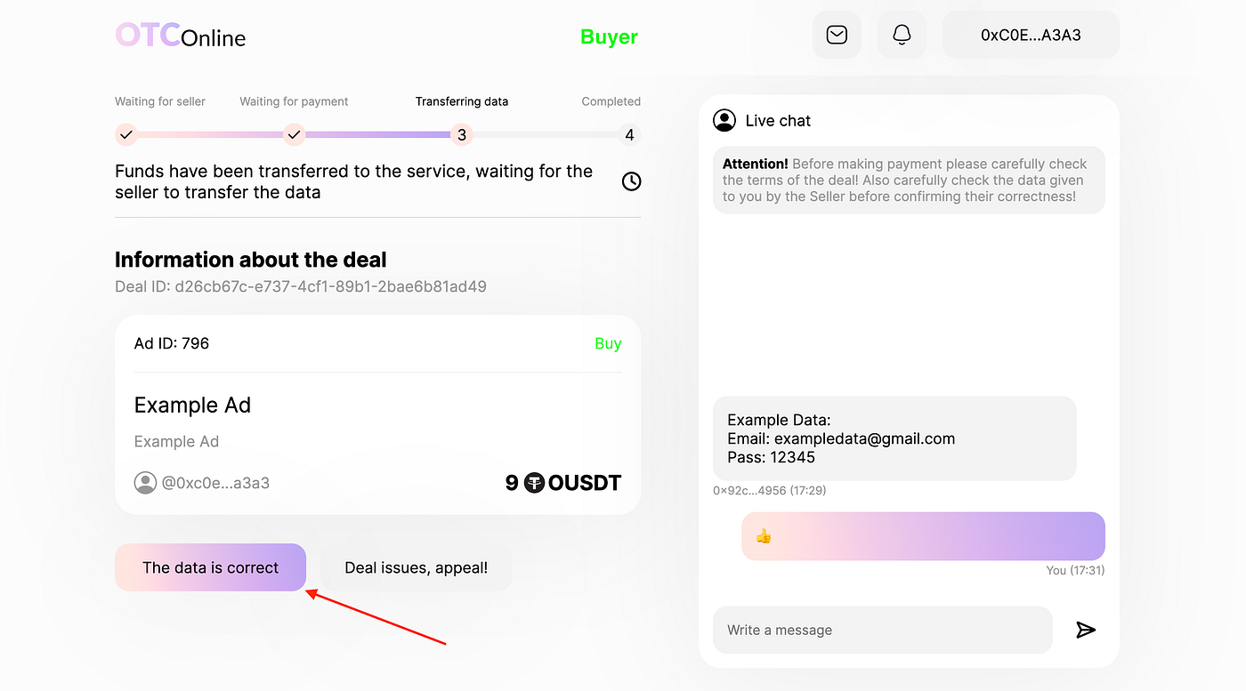 4.4. После оплаты, вы переходите к 3 этапу сделки. На этом этапе продавец должен передать данные покупателю, а покупатель должен проверить правильность данных. Если данные правильные, нажимаем "The data is correct" и подтверждаем транзакцию в Метамаске.